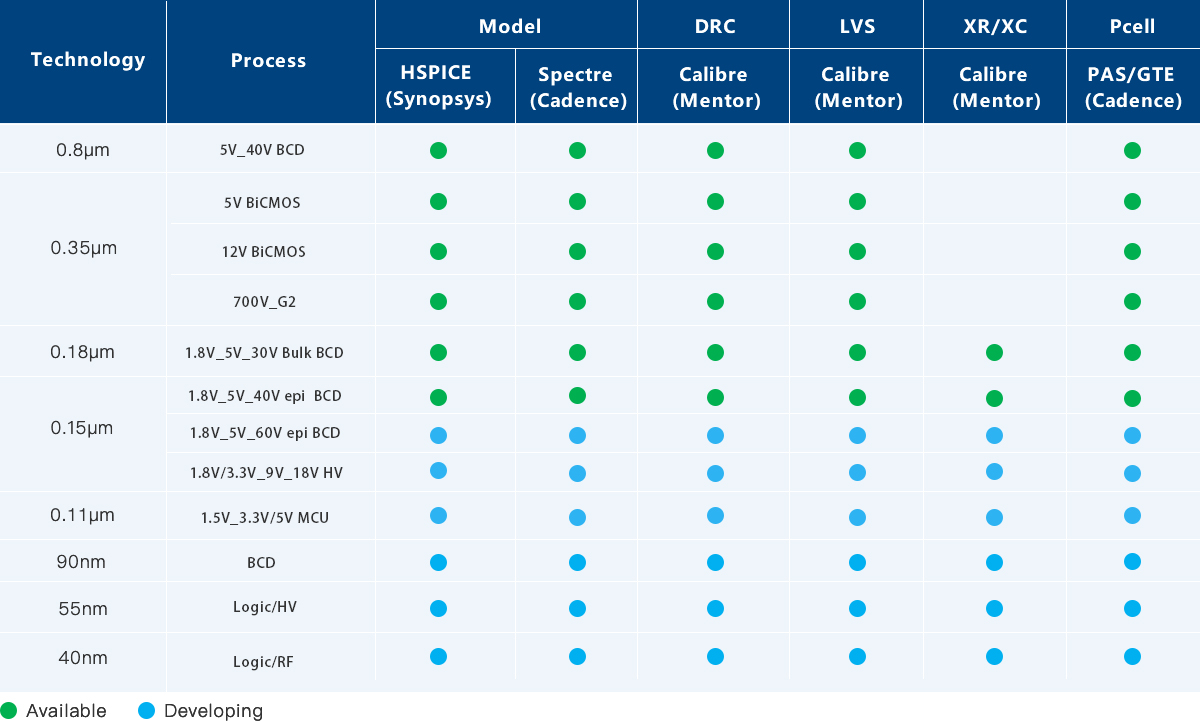 GTA provides complete Process Design Kits (PDK) for all process platforms. The technology nodes cover 0.8µm, 0.35µm, 0.15µm, 0.11µm and extend to 90nm, 55nm, 40nm. GTA offers technology files including design rules, spice models(HSPICE/Spectre), DRC, LVS and PEX, which can support customers to use mainstream EDA software tools for design and physical verification.